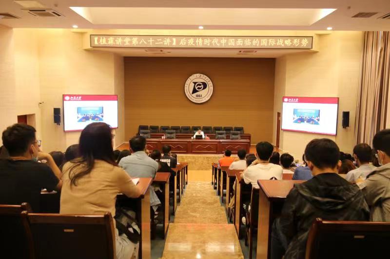 9月14日下午,经济管理学院于明德楼第二报告厅举办“植霖讲堂第八十二讲--后疫情时代中国面临的国际战略形势”专题讲座。北京大学国际关系学院教授翟崑担任主讲,经济管理学院院长长青教授、副院长郝晓燕教授主持讲座,200余名师生参加。