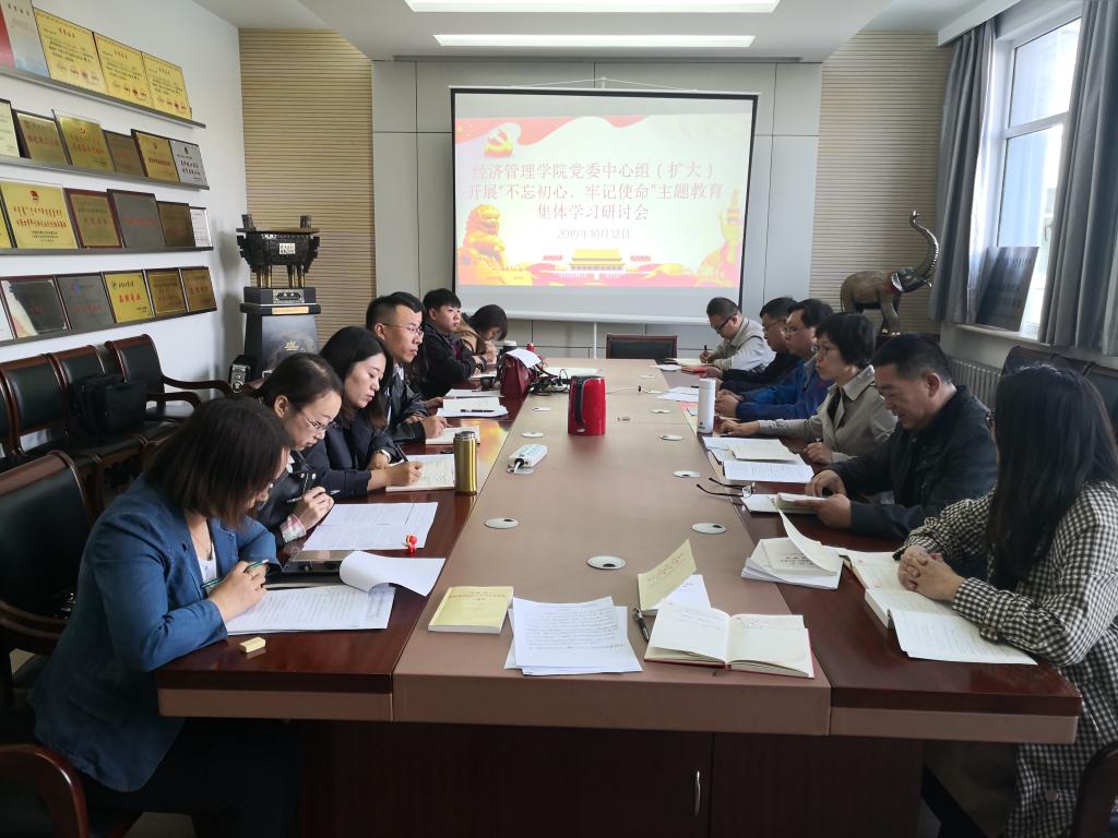 经济管理学院党委中心组(扩大)“不忘初心、牢记使命”主题教育第三次集体学习会于10月12日上午在新城校区主楼317会议室召开,院党委书记任慧主持会议,学院领导班子、党委委员、教工党支部委员、学生党支部书记参加了学习。