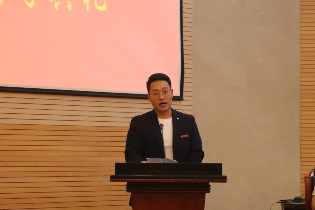 班主任代表林森发言,他鼓励2019级新生充分利用好大学的美好时光,不要虚度光阴,努力学习,学会独立,懂得感恩,时刻保持自立、自律、自强。