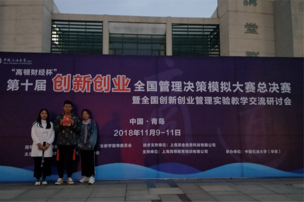 11月9日至11日,2018年“高顿财经杯”全国管理决策模拟大赛全国总决赛在中国石油大学(华东)举行。由经济管理学院符亚男指导,刘婕、吕旭敏、孙上惟同学代表学校参赛,荣获全国总决赛一等奖。