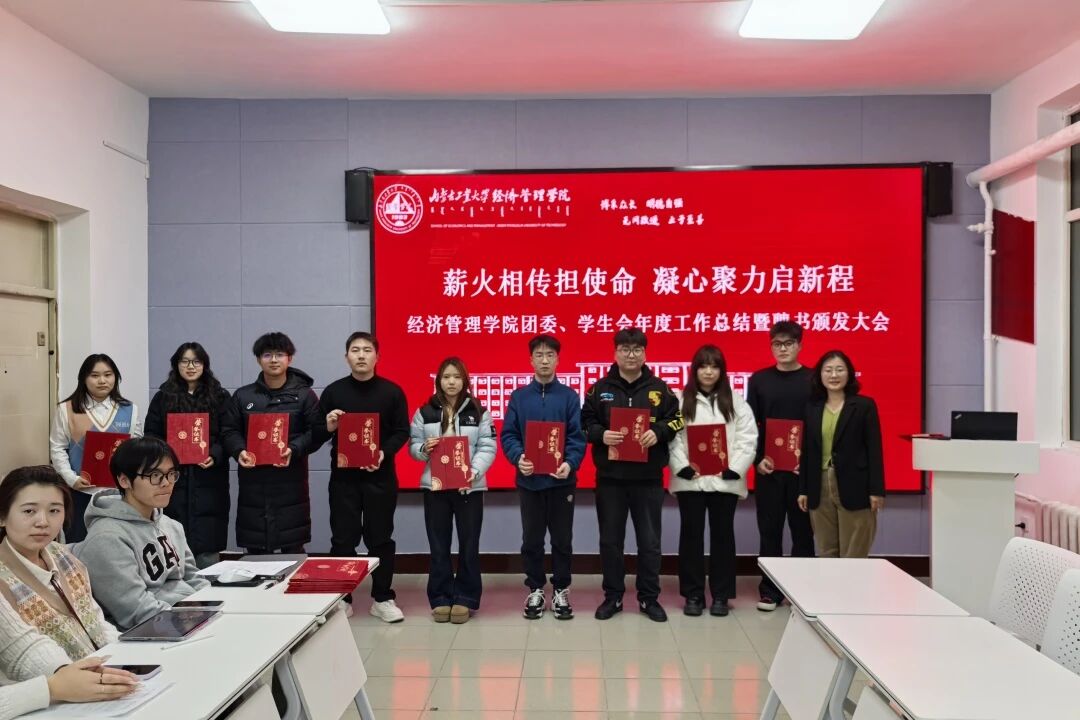 总结传承,夯实骨干责任。2025年12月30日,学院召开团委、学生会年度工作总结暨聘书颁发大会。会上肯定第七届团学骨干的付出并举行聘书颁发仪式,卸任骨干分享工作经验和成长感悟,新一届骨干代表围绕职责履行与未来规划进行深入交流。学院团委副书记吴宏宇老师寄语全体骨干,要以初心践行使命,在服务师生与学院发展中锤炼本领、凝聚合力。