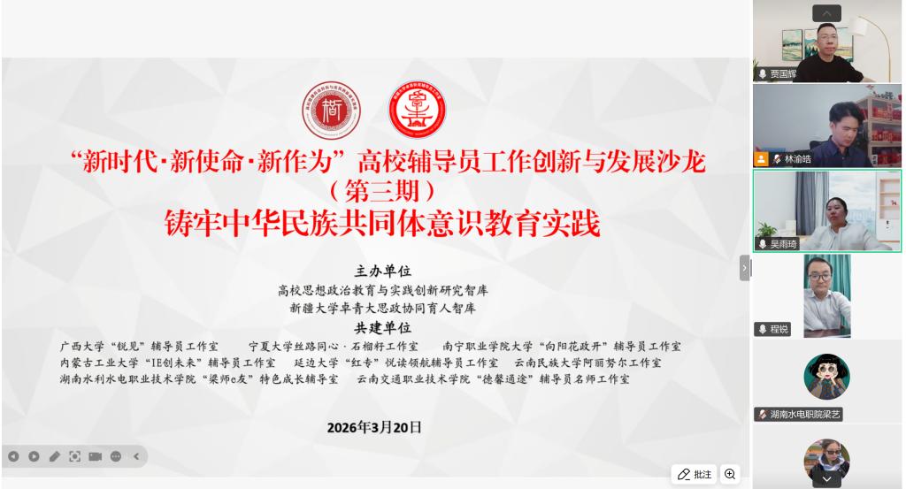 近日,“新时代·新使命·新作为”高校辅导员工作创新与发展沙龙(第三期) 线上成功举行。活动由高校思想政治教育与实践创新研究智库发起,联合全国十余所高校思政工作室联合打造,聚焦铸牢中华民族共同体意识教育实践与思想政治教育融合。内蒙古工业大学IE创未来辅导员工作室作为联建单位受邀参会,分享思政育人实践经验。